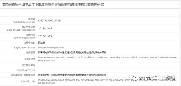 2018年11月,同濟(jì)大學(xué)附屬第十人民醫(yī)院在中國臨床試驗(yàn)注冊中心注冊了一項(xiàng)臍帶間充質(zhì)干細(xì)胞治療中重度斑塊型銀屑病的前瞻性隨機(jī)對照臨床研究 ,評價(jià)臍帶間充質(zhì)干細(xì)胞治療中重度斑塊型銀屑病的有效性和安全性,同時(shí)篩選出臍帶間充質(zhì)干細(xì)胞治療中重度斑塊型銀屑病的最佳劑量,為臨床應(yīng)用臍帶間充質(zhì)干細(xì)胞治療中重度斑塊型銀屑病提供必要的理論依據(jù),為銀屑病的治療指南或?qū)<夜沧R的制定提供循證醫(yī)學(xué)證據(jù)。