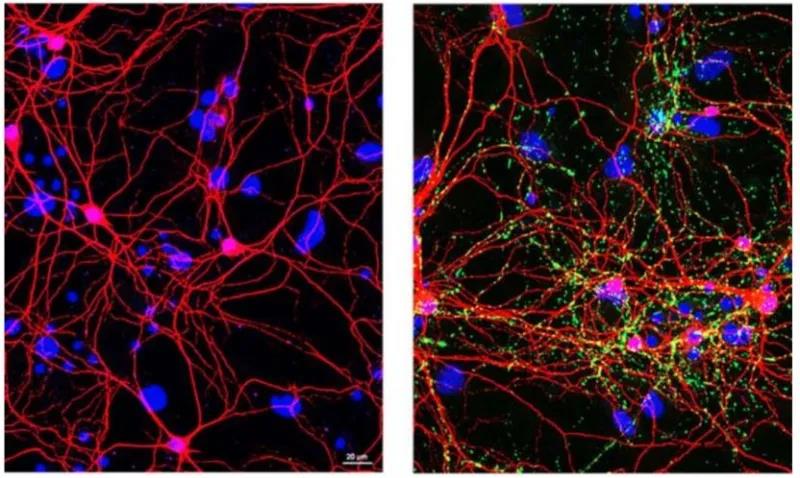 左圖來自小鼠大腦的健康神經(jīng)元的成像,右圖是帕金森小鼠受損神經(jīng)元的成像