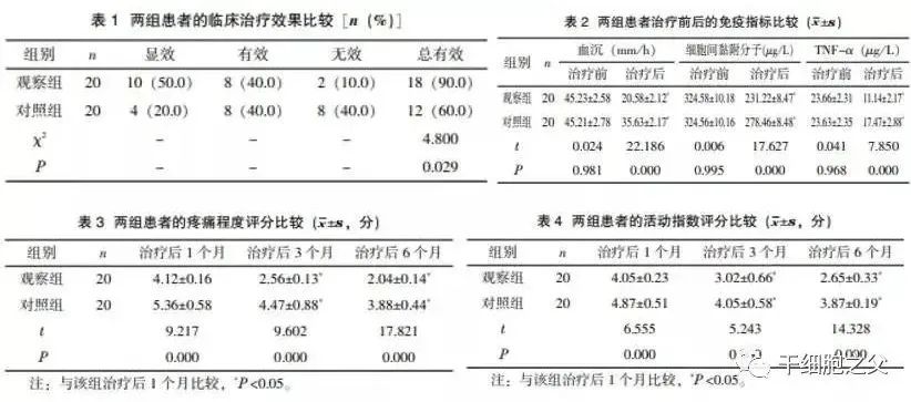 研究結果顯示,采用間充質干細胞的類風濕性關節(jié)炎受試者,明顯緩解和減輕臨床癥狀,其顯效率、有效率均明顯高于對照組。