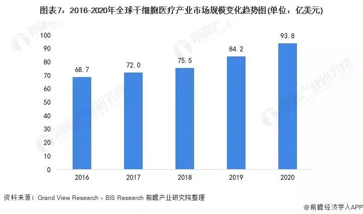 由于干細(xì)胞治療廣闊的應(yīng)用前景,全球干細(xì)胞行業(yè)迅猛發(fā)展,市場(chǎng)規(guī)模逐漸擴(kuò)大。近年來(lái),干細(xì)胞研究及應(yīng)用已成為衡量一個(gè)國(guó)家生命科學(xué)與醫(yī)學(xué)發(fā)展的重要指標(biāo),許多國(guó)家對(duì)干細(xì)胞研究大力支持。根據(jù)國(guó)際研究機(jī)構(gòu)Grand View Research的研究數(shù)據(jù)顯示,全球干細(xì)胞市場(chǎng)規(guī)模從2016年的68.7億美元增長(zhǎng)到2020年的93.8億美元。與此同時(shí),BIS Research的研究數(shù)據(jù)顯示,2018年全球干細(xì)胞市場(chǎng)規(guī)模為75.54億美元。