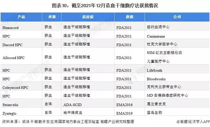 目前獲批的造血干細(xì)胞療法是10種,包括 FDA的8種臍血產(chǎn)品和EMA批準(zhǔn)的2種自體造血干細(xì)胞基因療法,Strimvelis用于腺苷脫氨酶缺乏癥(ADA-SCID),Zynteglo用于治療輸血依賴性地中海貧血癥。