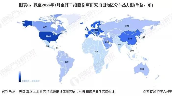 目前全球登記的干細(xì)胞臨床研究項(xiàng)目主要是成體干細(xì)胞臨床試驗(yàn),涉及血液病、腫瘤、神經(jīng)系統(tǒng)疾病、心臟疾病、免疫系統(tǒng)疾病等領(lǐng)域,其中美國(guó)保持絕對(duì)領(lǐng)先的地位,截至2022年1月4日,美國(guó)干細(xì)胞臨床研究項(xiàng)目數(shù)量達(dá)到2865項(xiàng);中國(guó)、法國(guó)和德國(guó)的干細(xì)胞臨床研究項(xiàng)目數(shù)量分別為659項(xiàng)、378項(xiàng)和329項(xiàng)。